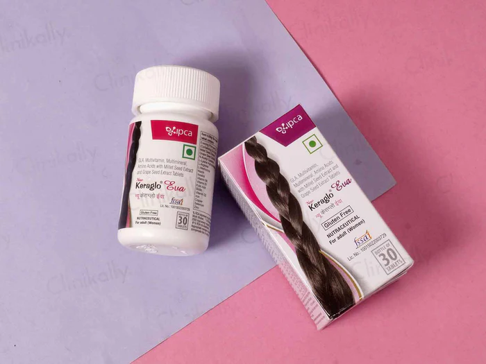 IPCA Keraglo Eva Tablet is a premium nutraceutical formulated specifically for adult women to support healthy hair growth and reduce hair fall. It contains a balanced combination of GLA, multivitamins, multiminerals, amino acids, millet seed extract, and grape seed extract that work synergistically to nourish hair follicles from within. This gluten-free hair supplement helps improve hair strength, thickness, and shine while supporting scalp nutrition and overall hair vitality. Ideal for women experiencing hair thinning, nutritional deficiencies, or stress-related hair concerns, it promotes stronger, healthier, and more resilient hair with regular use.